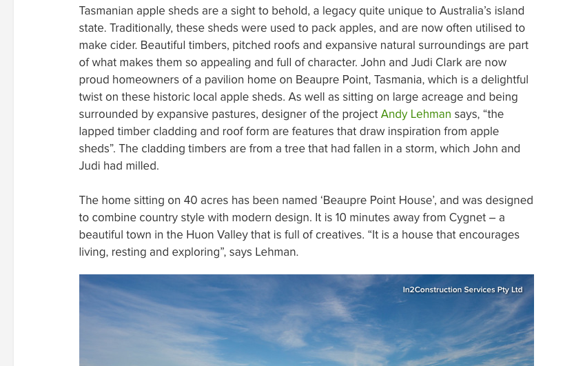 September 13, 2021September 20, 2022 Melissa Cowan Houzz Tour: Tasmanian pavilion home an ode to local apple sheds Read the rest of the article at Houzz here. Share this: Click to share on X (Opens in new window) X Click to share on Facebook (Opens in new window) Facebook Like Loading... Related